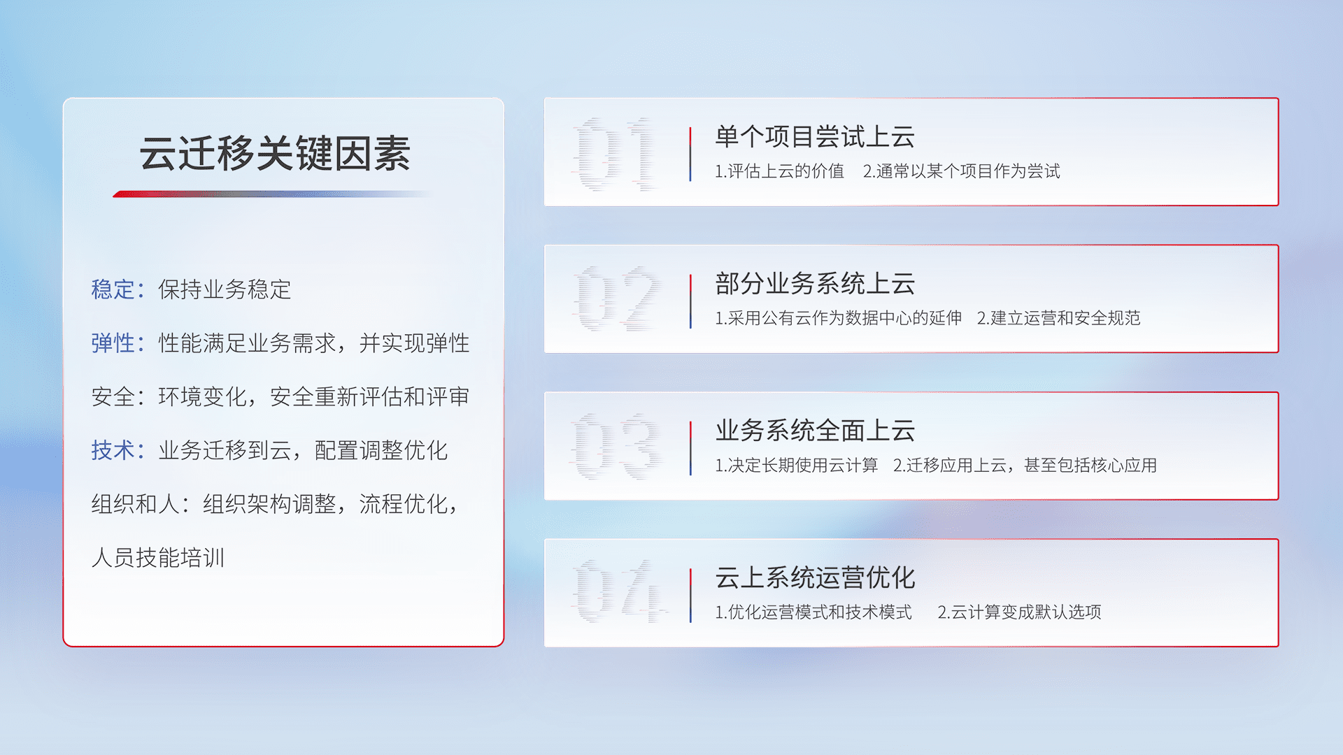 结合实际业务,,,,从规划设计、、、云平台选型、、、、云原生改造、、数据迁移、、、、集成交付,,迁移全过程为客户识别最佳上云路径,,,做好风险识别管理,,设计网络架构、、身份权限、、、安全审计合规、、、操作审计、、、日志审计、、监控告警策略、、、多站点容灾设计等,,,对云上基础设施进行整体规划,,,提升IT治理水平,,,,以满足弹性、、、高可用、、、高性能的需求。。。。