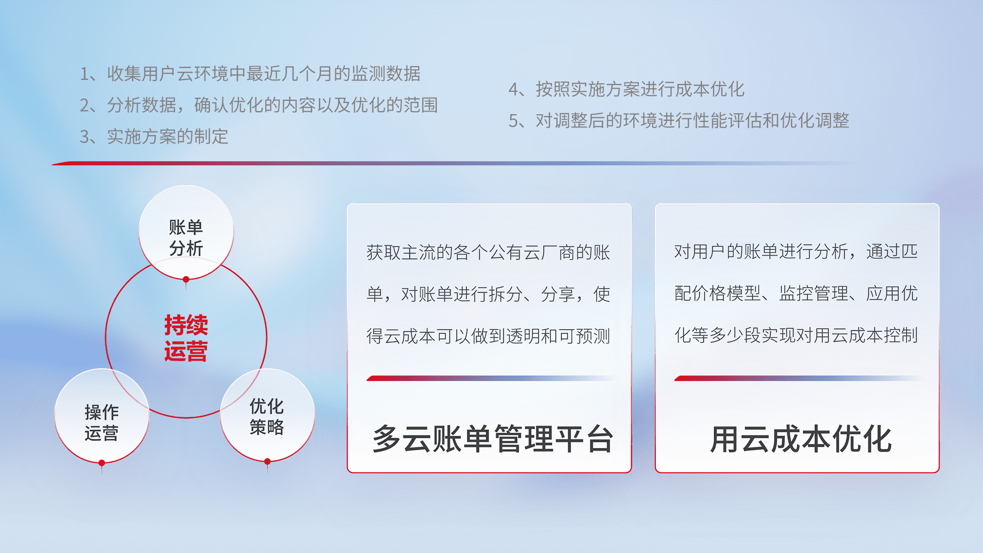 通过多云纳管,,,以统一的资源数据模型把客户的云资源进行抽象和封装,,,,进而实现对多云资源的统一操作,,,保障云资源管理的可靠性、、、稳定性与可用性。。。量身定制化运维内容,,,配置、、、开发运维、、、补丁管理、、备份、、、监控、、、认证和访问管理、、审计和日常巡检等,,,,保障在用云过程中的可靠度,,,稳定度以及高可用率。。。