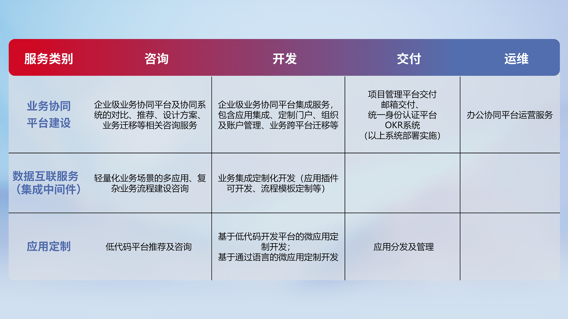 针对钉钉、、、企微、、、、IDaas等平台级产品提供产品的规划、、、方案、、、交付、、定制化开发等服务,,,,实现如统一协同办公、、、智能客户服务、、混合会议管理、、、、智能数据查询、、等业务场景,,,,实现数字化转型。。